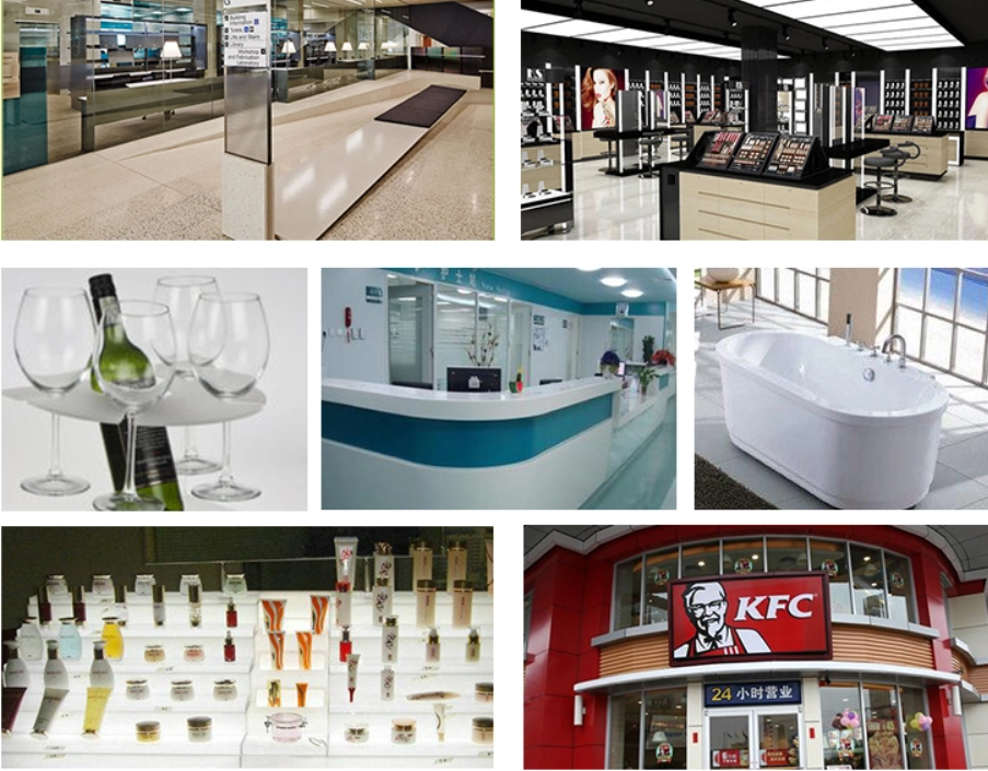 حاجب الشمس ، لوح عزل الصوت (لوحة شاشة الصوت) ، كشك الهاتف ، حوض السمك ، ألواح الجدران الداخلية ، الديكورات الفندقية والسكنية ، الإضاءة ، إلخ.